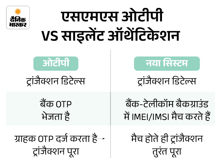 देश के बड़े प्राइवेट बैंक और टेलीकॉम कंपनियां ‘साइलेंट ऑथेंटिकेशन’ तकनीक पर काम कर रही हैं। इससे ऑनलाइन पेमेंट करने पर वन-टाइम पासवर्ड (OTP) की जरूरत खत्म हो जाएगी। यह सिस्टम बैकग्राउंड में ही चेक कर लेगा कि बैंक एप में रजिस्टर्ड नंबर और फोन का सिम कार्ड मैच कर रहे हैं या नहीं।